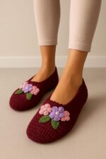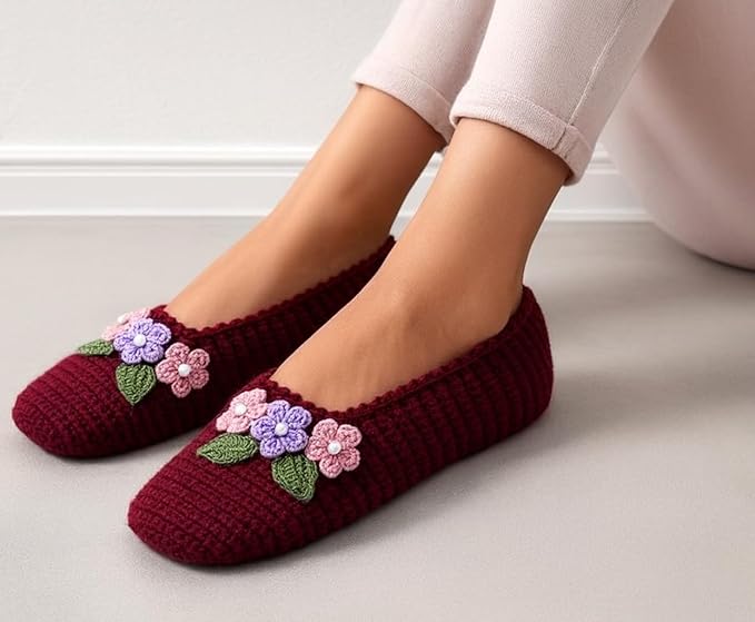 Amazing Basket Handmade Crochet woollen socks, Burgundy Knit House socks with Purple and Pink Floral Applique, Indoor Footwear