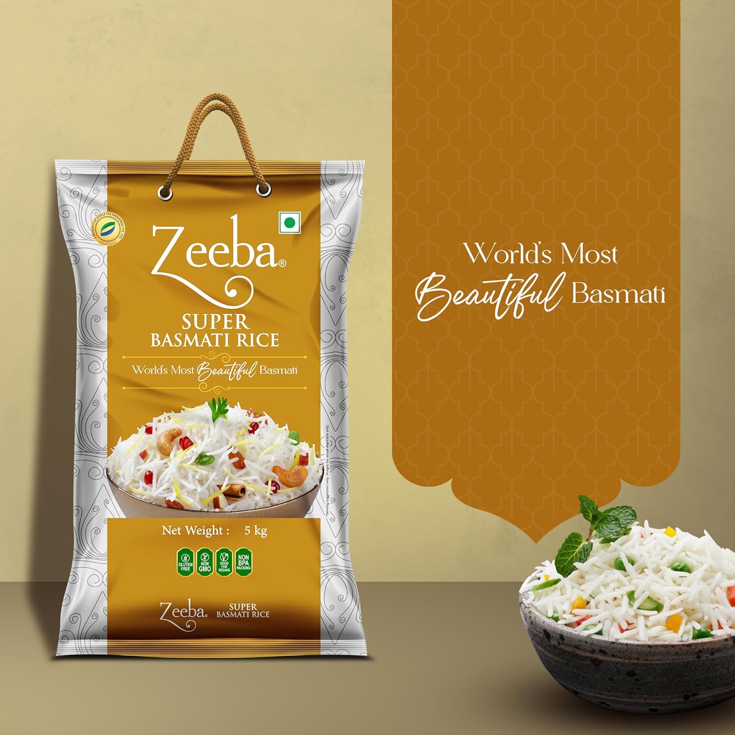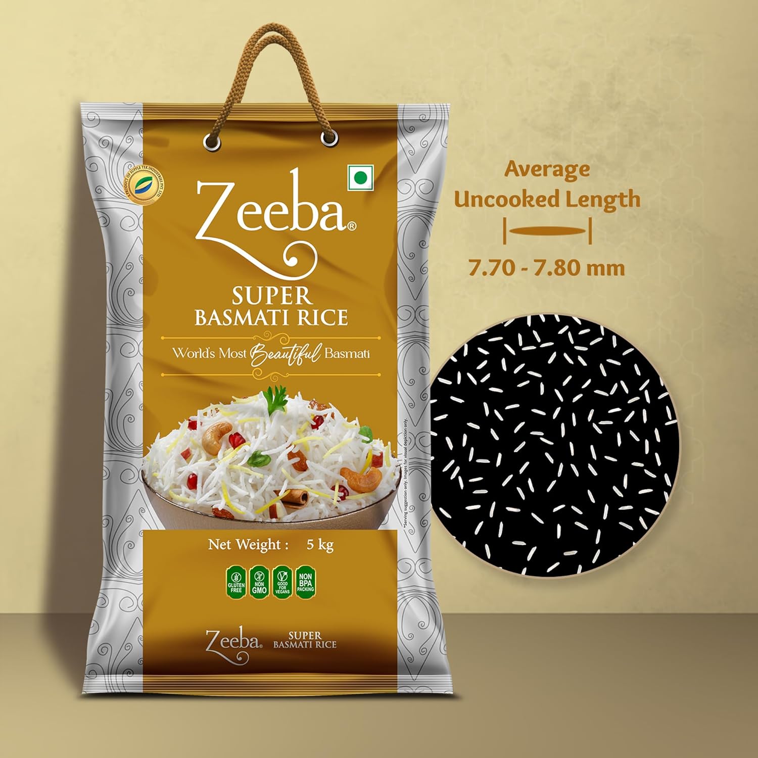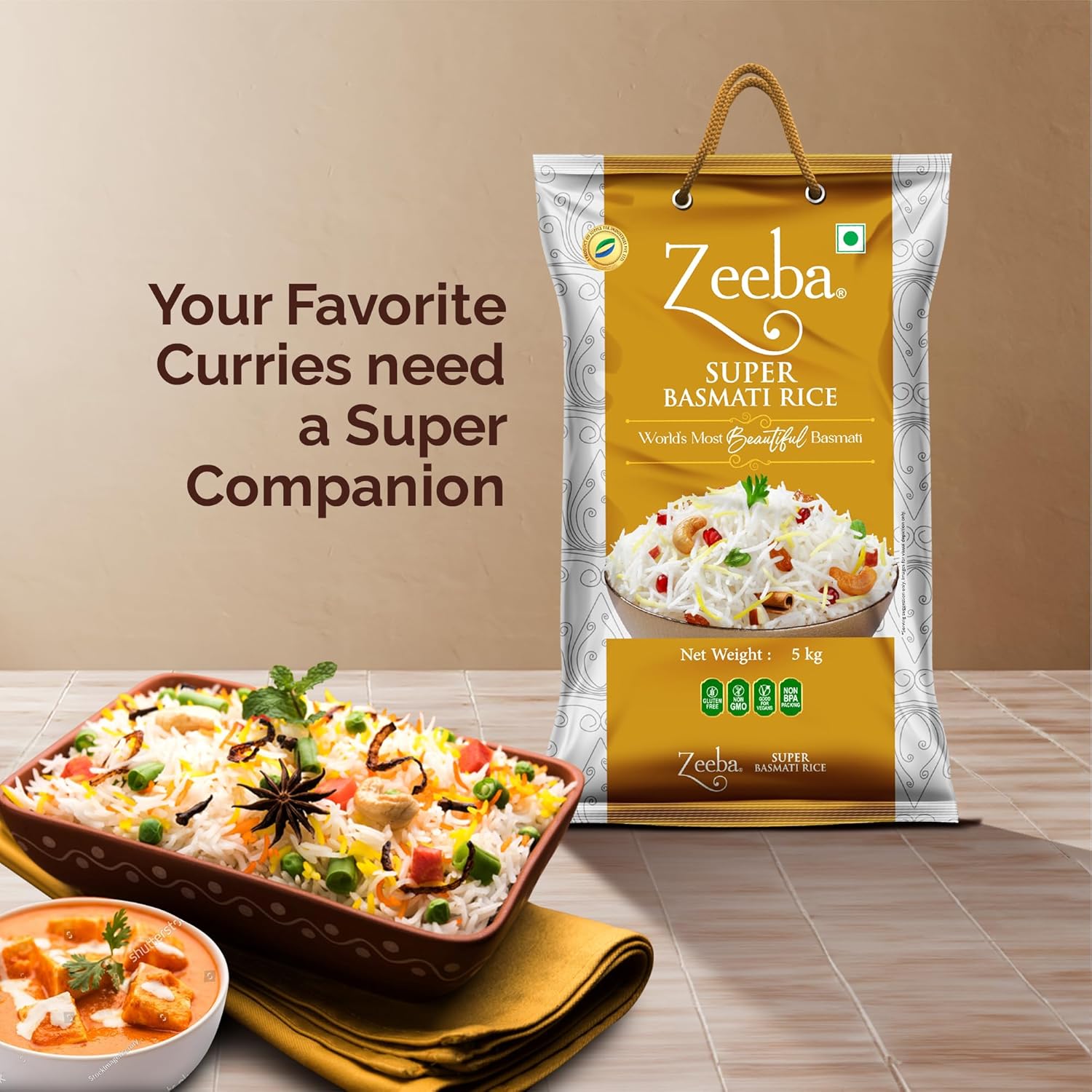 Zeeba Super Basmati Rice 5 Kg, Fluffy & Naturally Aromatic, Gluten Free Fine Grains (Cooked length upto 23mm*)