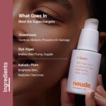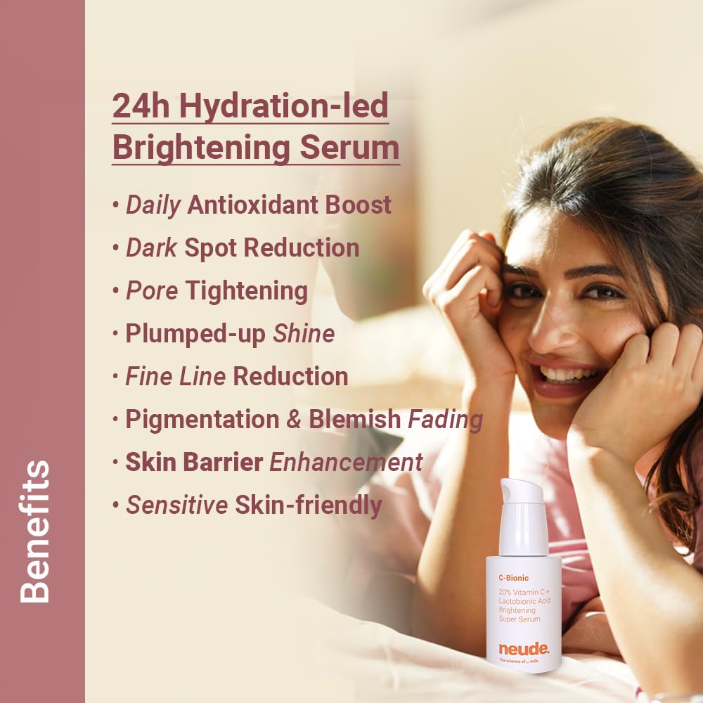 - 24h HYDRATION + SKIN BRIGHTENING: Neude C-Bionic 20% Vitamin C Serum with Lactobionic Acid comes rich in a unique active Hydragen Aquaporin that helps hydrate skin for 24 hours. Vitamin C + Lactobionic Acid as an au glow pair, prevents Transepidermal Water Loss and locks in moisture for skin that’s supple and bouncy, while Vitamin C, Glutathione and Milk actives work on brightening the skin and reducing dark spots, pigmentation, and blemishes.