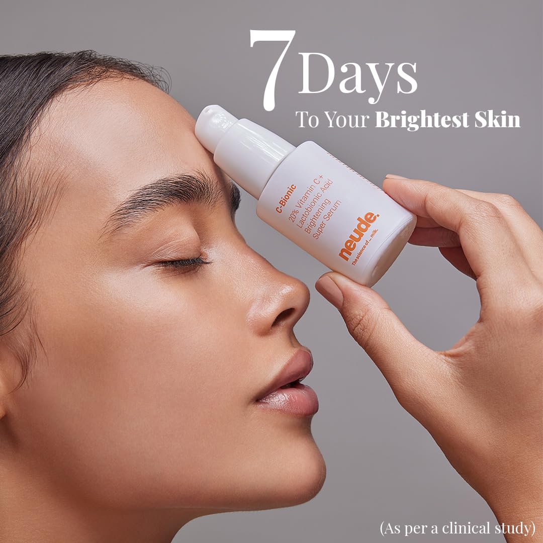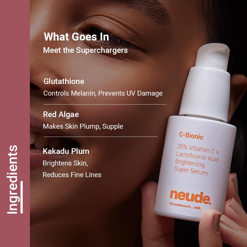 - 20% VITAMIN C + LACTOBIONIC ACID SUPER SERUM: A Vitamin C serum for face that comes with the benefits of a Lactobionic Acid serum and the highest, most stable concentration of Vitamin C, to give you bright, hydrated, Hi-Glaze skin. Neude C-Bionic is a revolution in vitamin C skincare with milk’s ultra-gentle discovery, Lactobionic Acid, for ultimate skin recovery and cell-resurfacing so that your skin glows anew. It also has a blend of high-performance actives and natural ingredients, bringing in a comforting texture for skin that feels supple and glowing with each drop.
