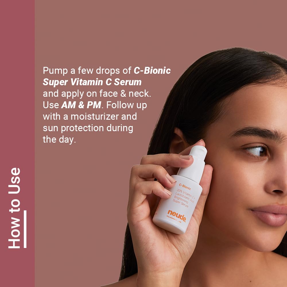 - INTENSE SKIN-SMOOTHENING & BRIGHTENING ACTIVES: Smooth, bright and hydrated skin – Neude C-Bionic 20% Vitamin C Serum for face gives all of it and more courtesy a breakthrough formulation that literally helps break through the cells to give intense, lasting smooth hydration and brightening. The non-sticky hydrating texture seeps deep into the skin to leave it bouncy and supple, as the actives work in skin brightening, resurfacing skin cells, reducing dark spots & pigmentation, and more.