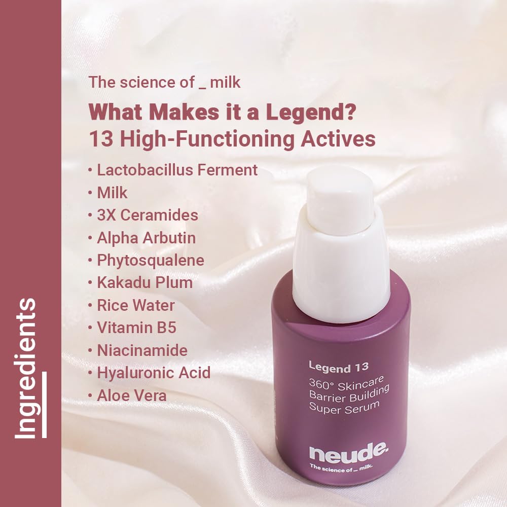 - SUPER SERUM WITH 13 MULTIACTIVES+MILK PROBIOTIC: Neude Legend 13 is a super face serum for face with 13 high-functioning multiactives targeted to repair, build, and re-texture skin barrier. Led by milk’s revolutionary probiotic Lactobacillus Ferment, this is the best face serum to support skin’s natural barrier and promote new cell growth. This face serum also has Milk that helps unclog pores to deeply nourish the skin and a cocktail of 13 skin-repairing and replenishing actives. It’s The science of _ milk at its finest.