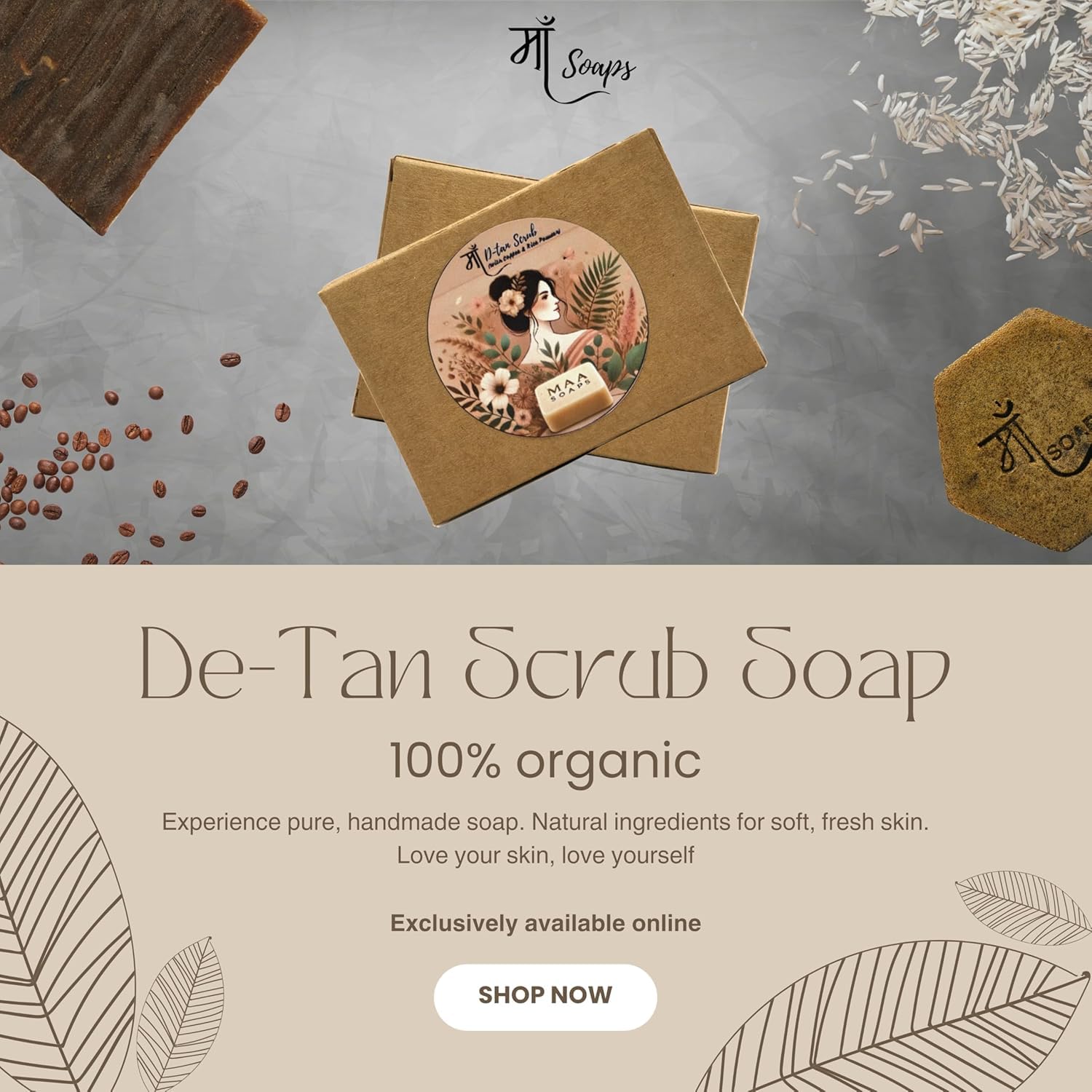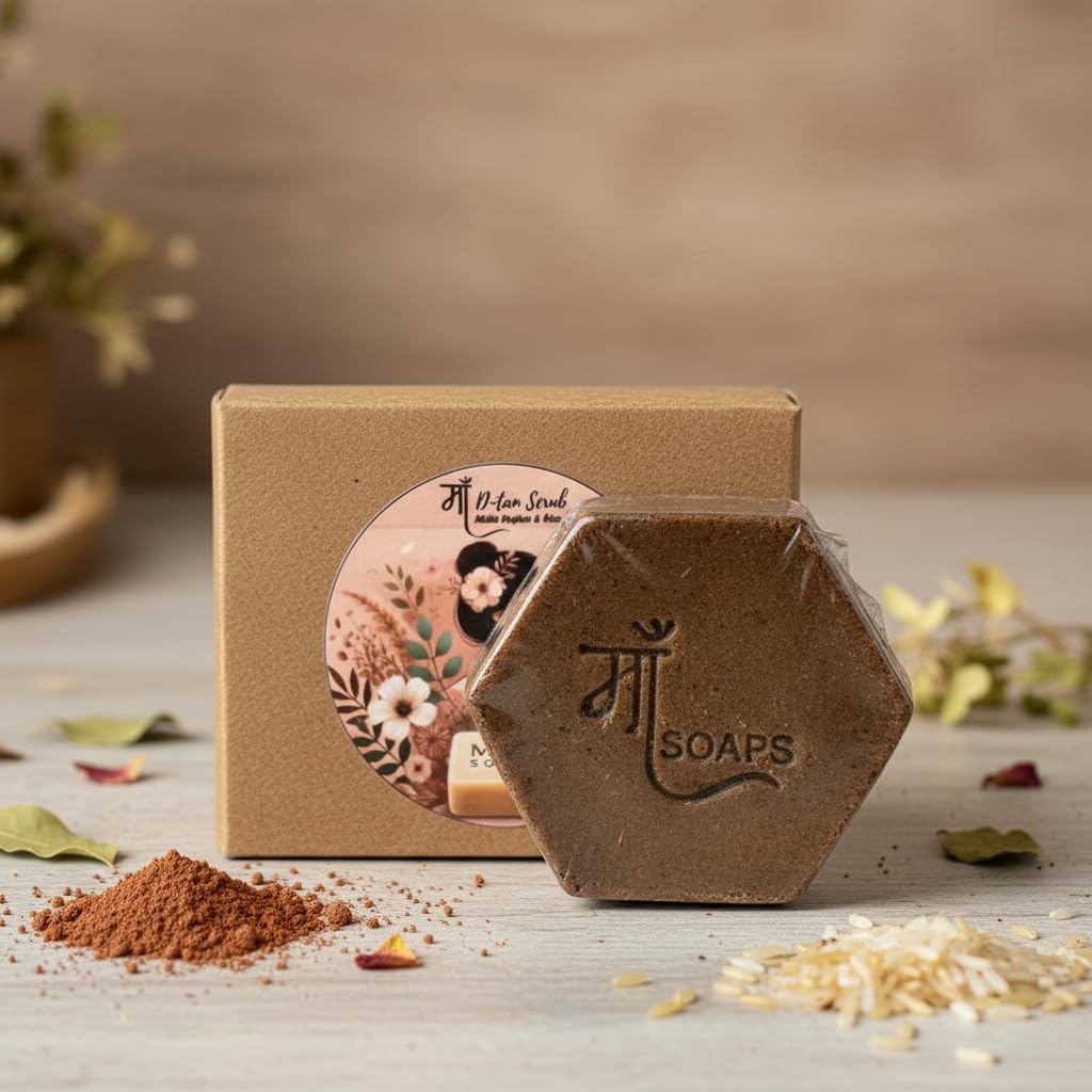 - Handmade de-tan scrub soap blending rice powder, coffee powder, honey, and glycerine