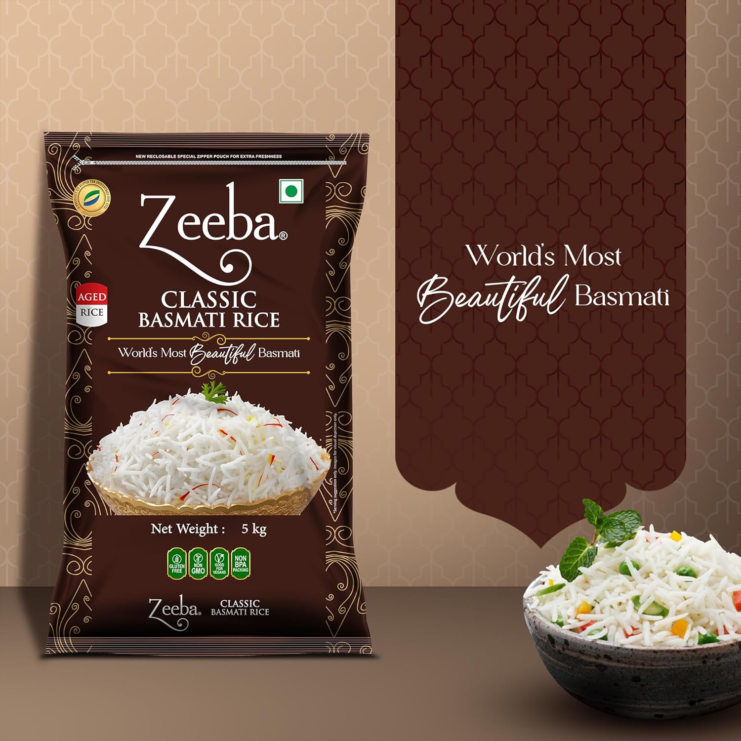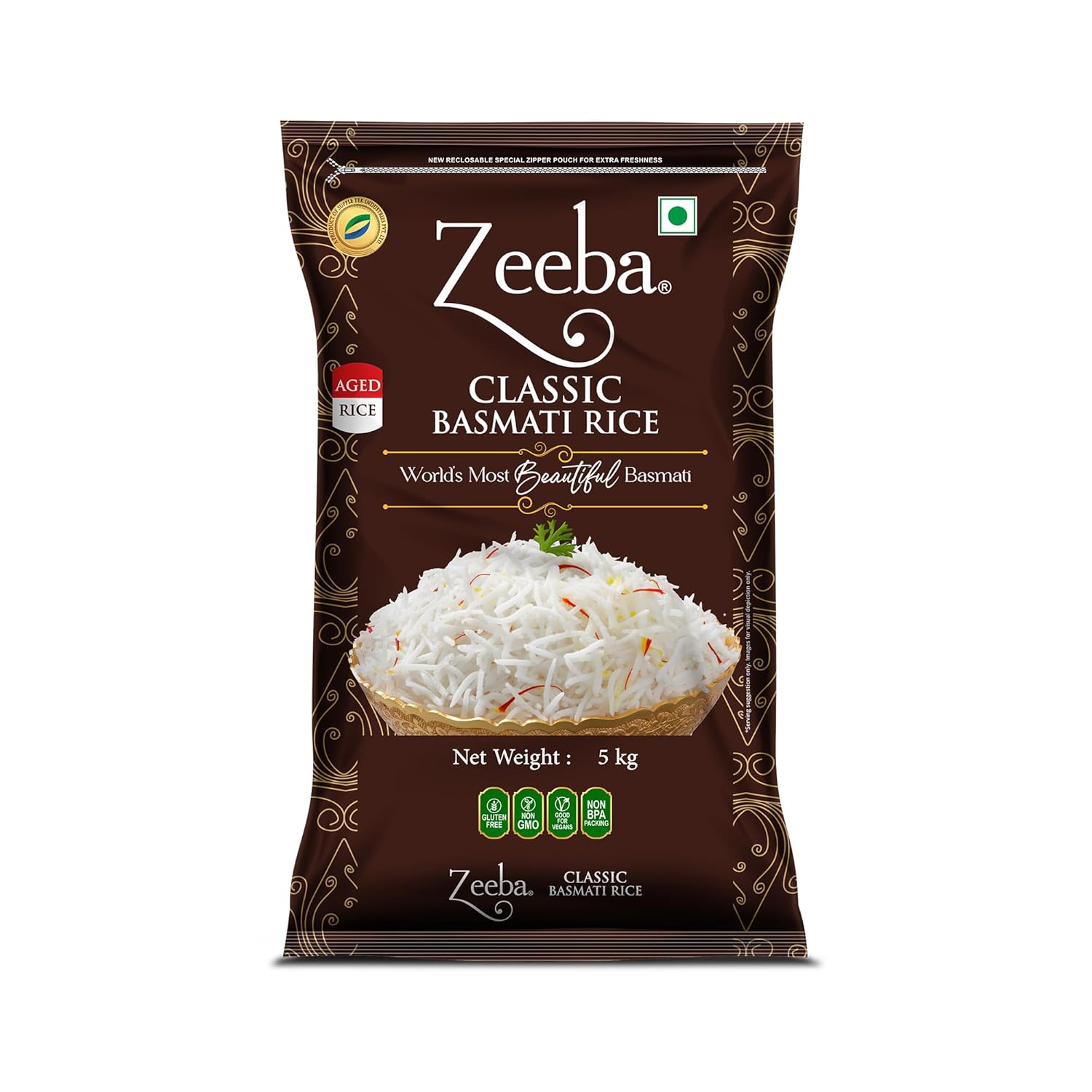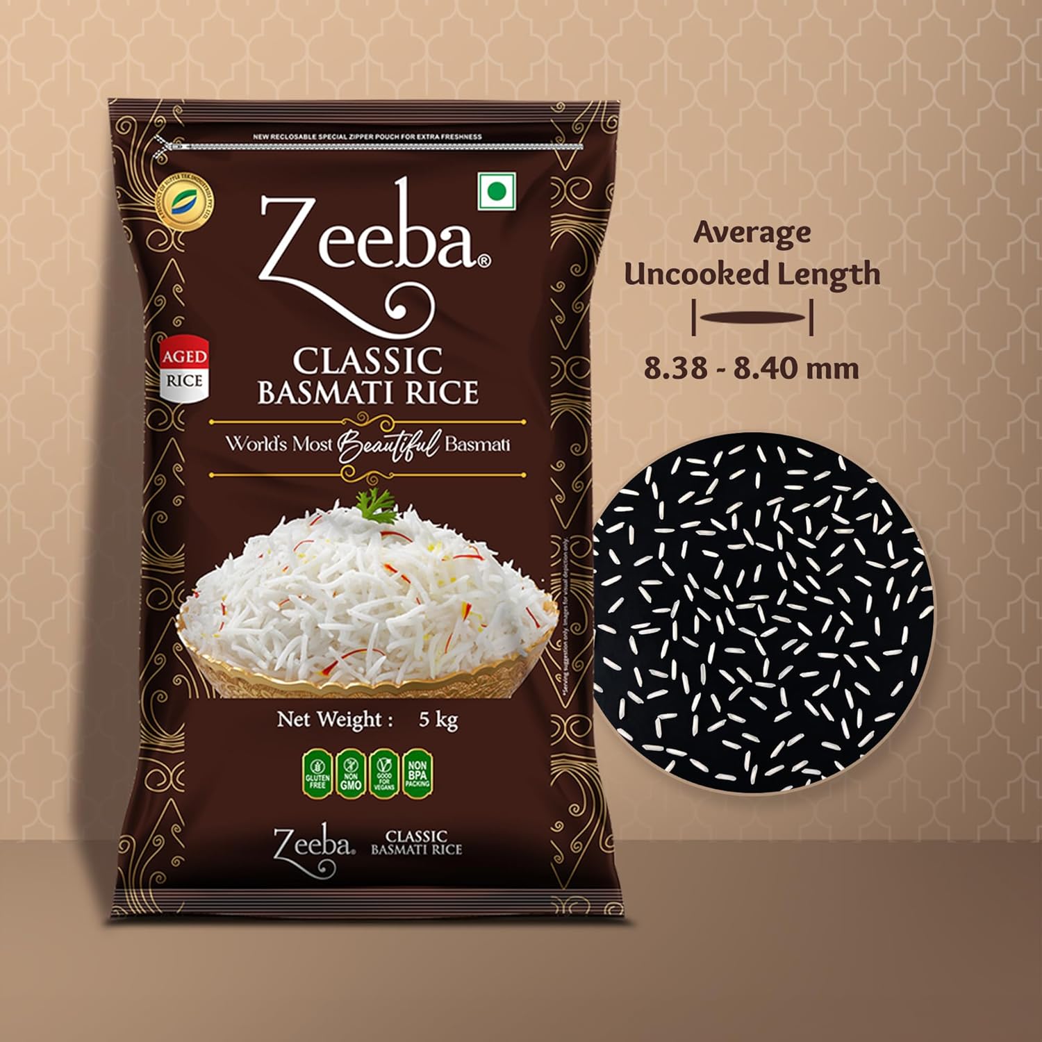 - About Classic : Zeeba Classic Basmati Rice has extra long grain. Every grain of this Basmati Rice has exceptional grain length, which elongates to more than double its size upon cooking and has a pleasant rice aroma and elongates 2.5 times.